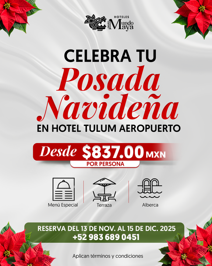 Servicio Aplicable: La promoción está sujeta exclusivamente al menú especial de Posadas del Hotel Tulum Aeropuerto.