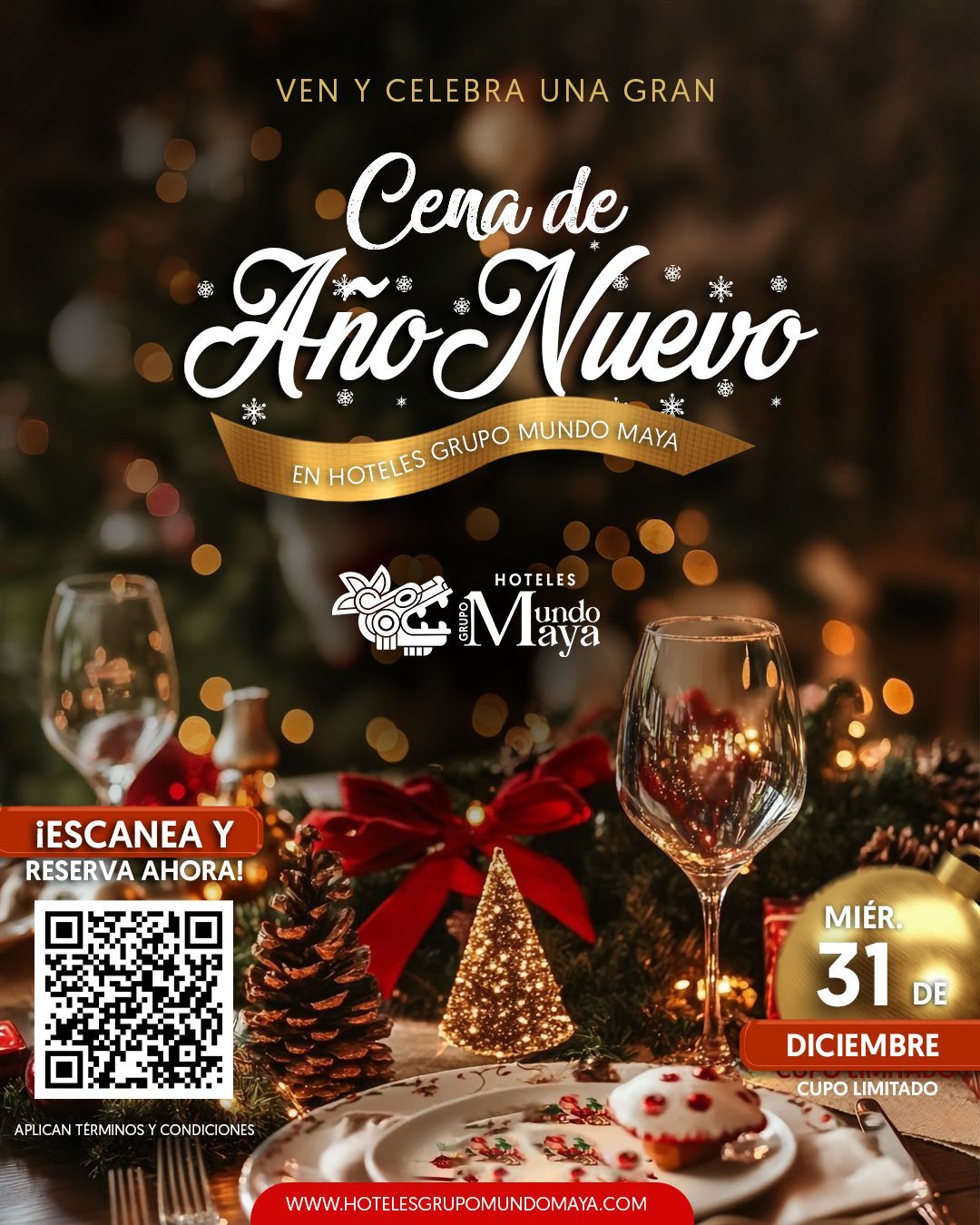 - Aplica a: Exclusivamente al menú especial de la Cena de Año Nuevo de los Hoteles Grupo Mundo Maya participantes.