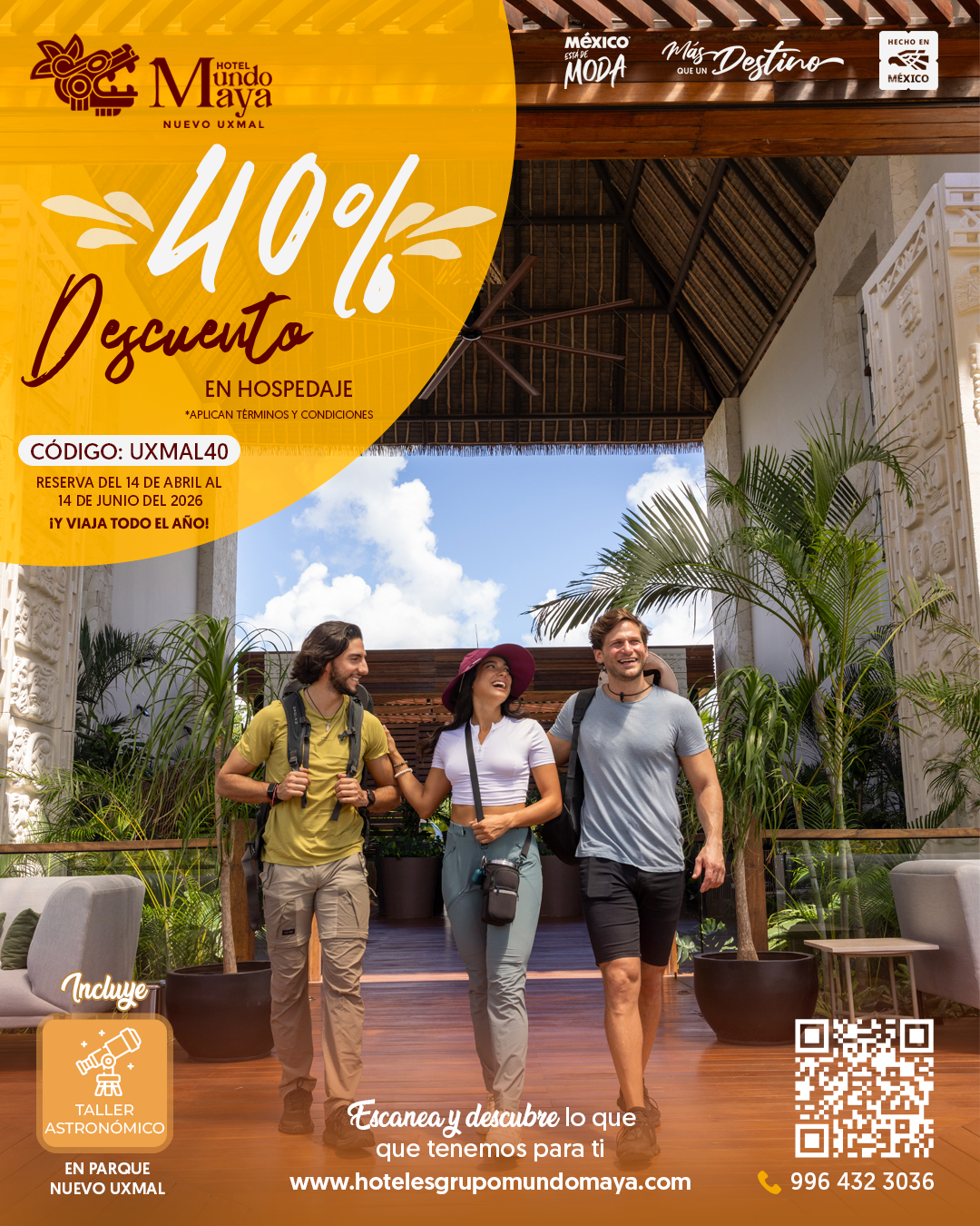 Canal de venta: Promoción disponible exclusivamente a través del sitio web oficial www.hotelesgrupomundomaya.com ingresando el código: UXMAL40.